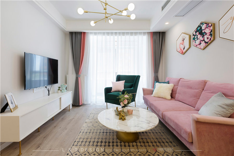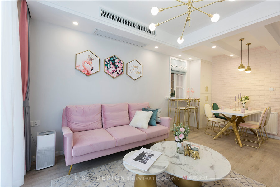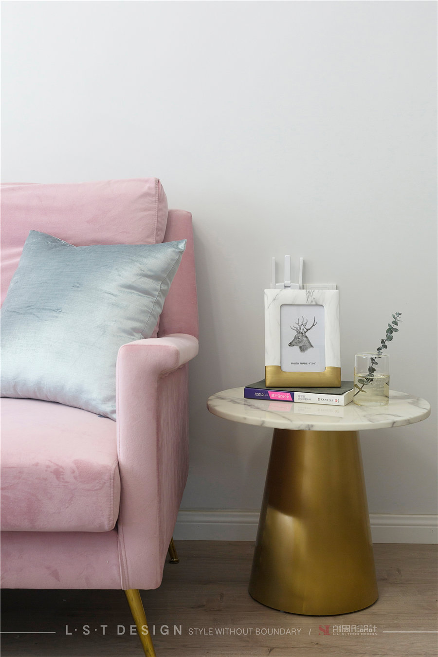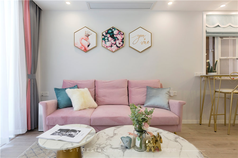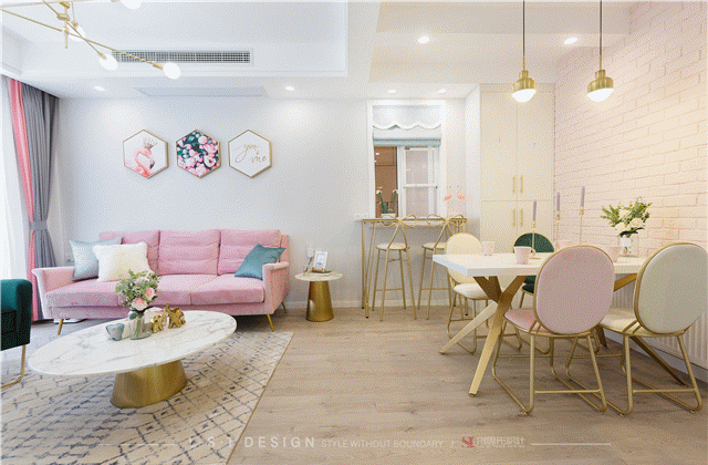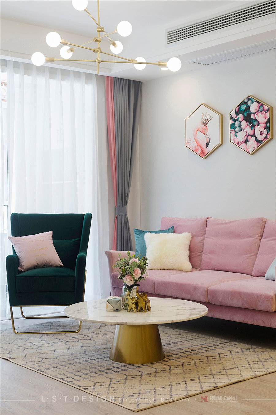 ▲入户第一眼便可看见柔粉色沙发,空间一下俏皮了很多;墨绿色丝绒的单人沙发以及金色大理石茶几也是恰到好处,将梦幻和精致进行完美的融合。
