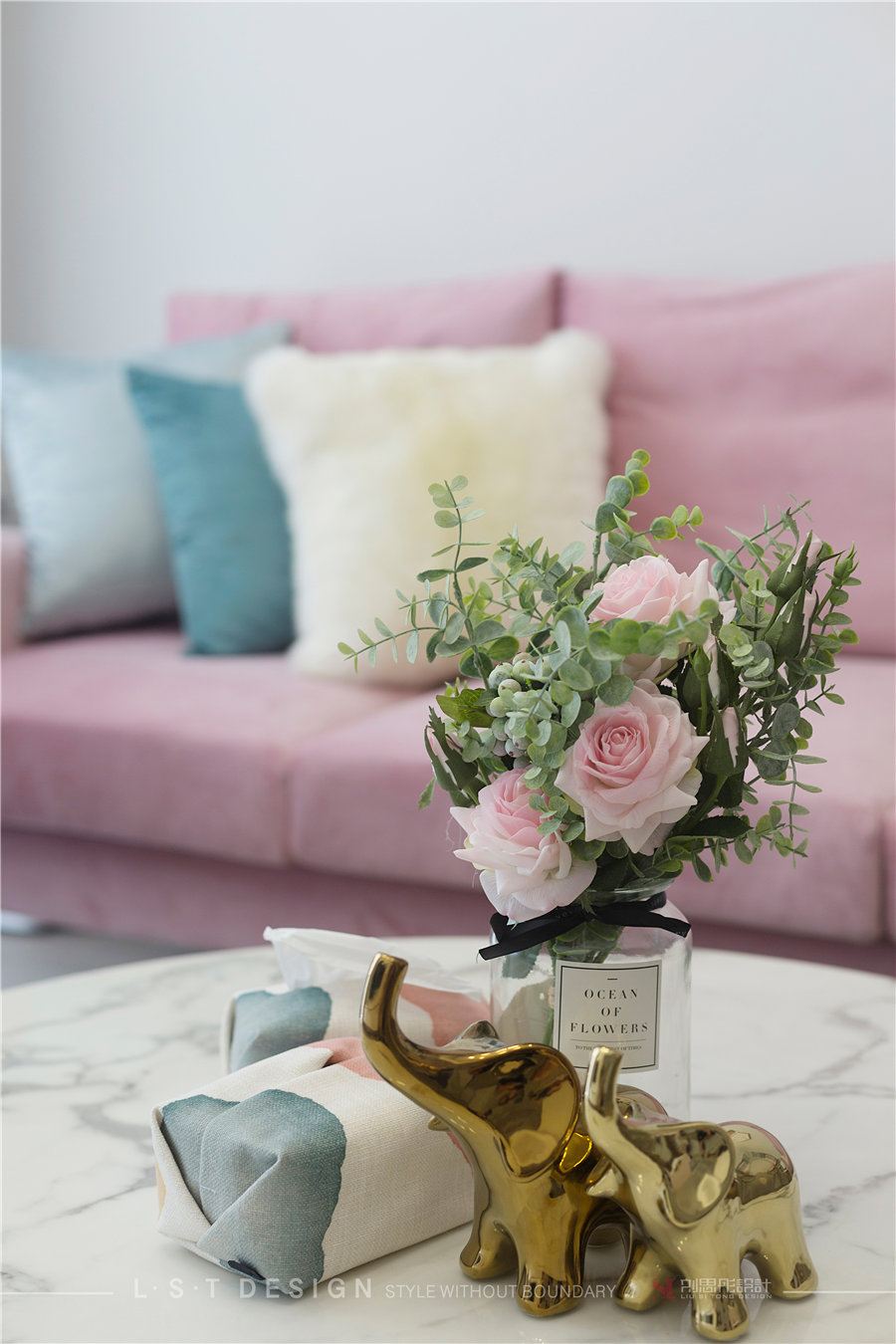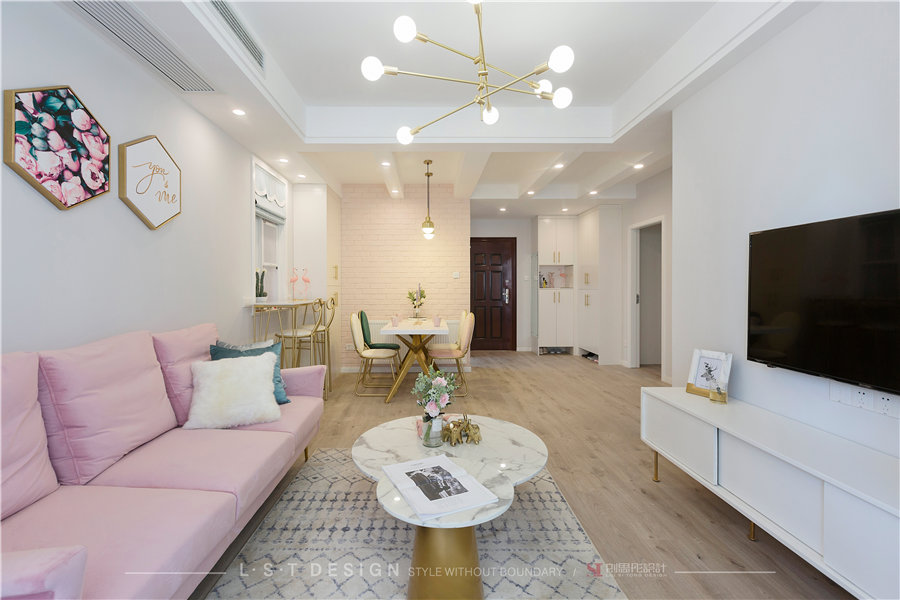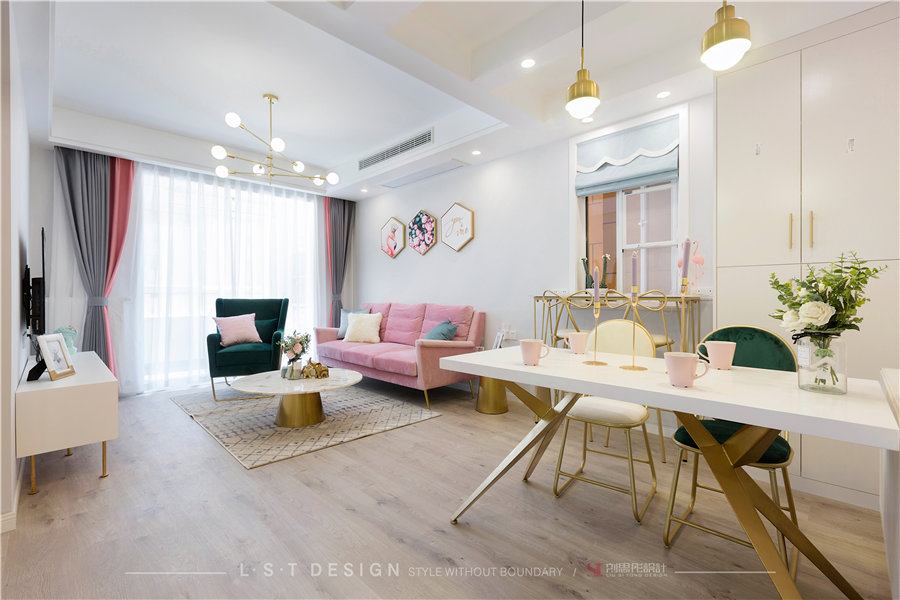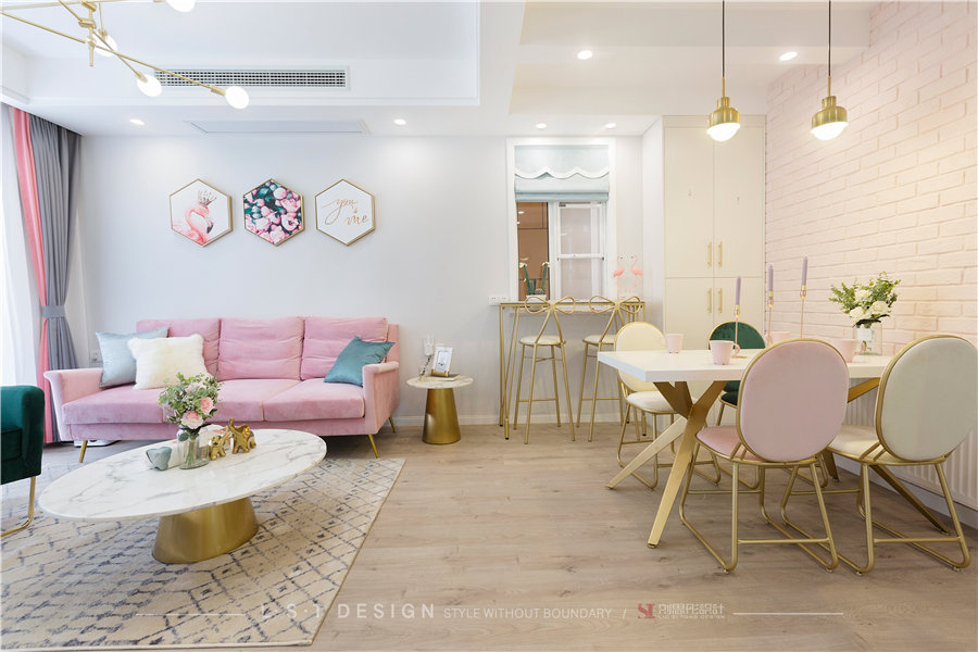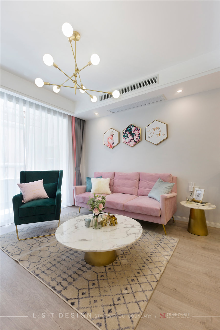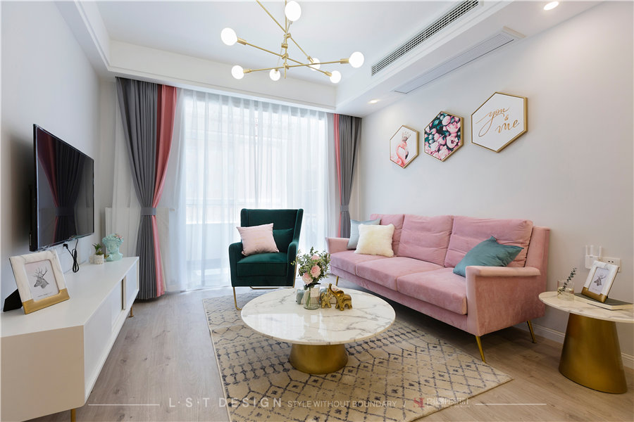 ▲入户第一眼便可看见柔粉色沙发,空间一下俏皮了很多;墨绿色丝绒的单人沙发以及金色大理石茶几也是恰到好处,将梦幻和精致进行完美的融合。