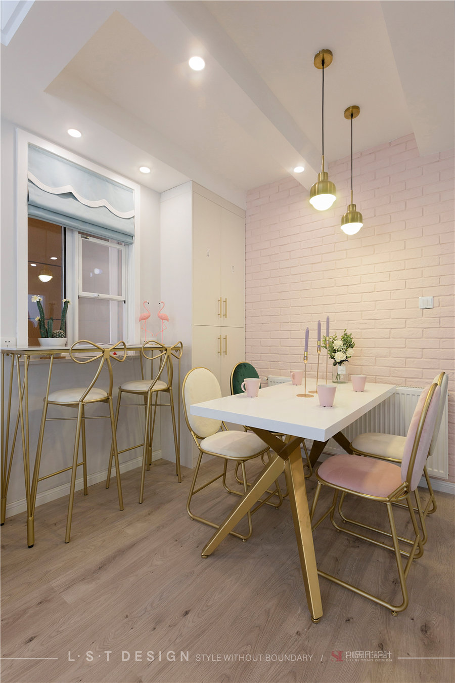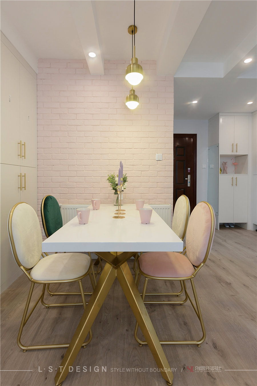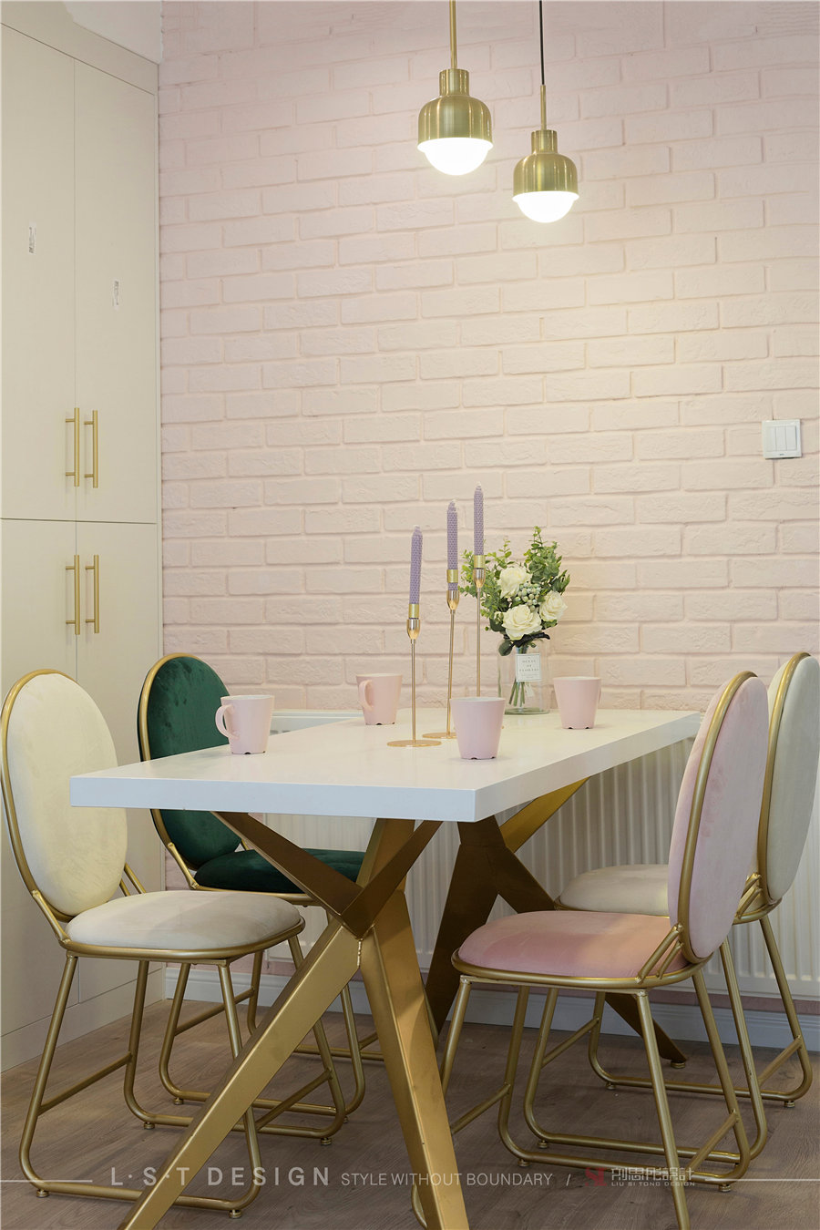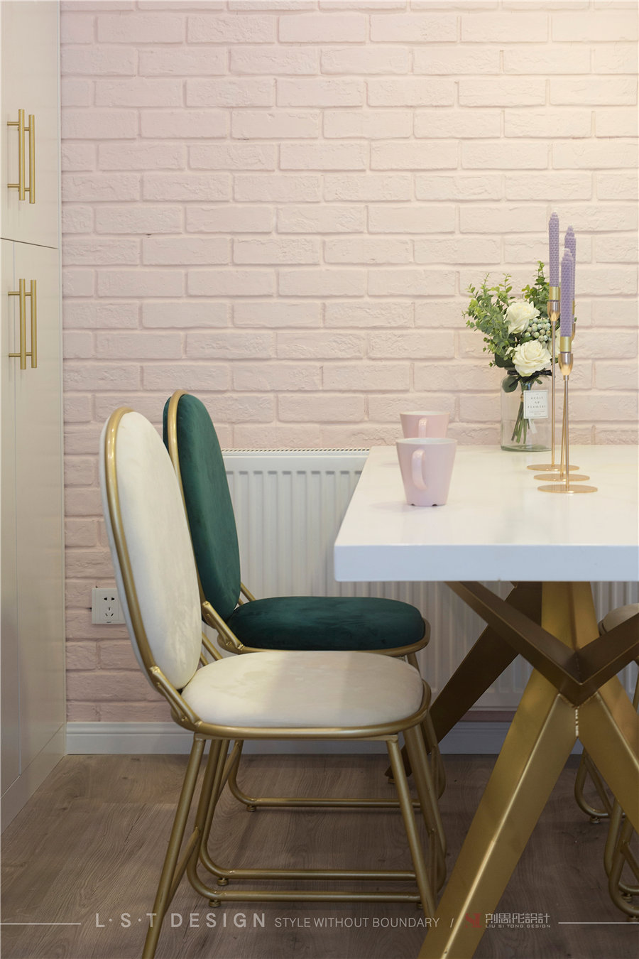 ▲浅粉色的文化砖,搭配白色餐桌,粉色和墨绿色餐椅跳跃其中,金色吊灯与餐桌椅的金属质感,将餐厅增加了餐厅精致与生气。