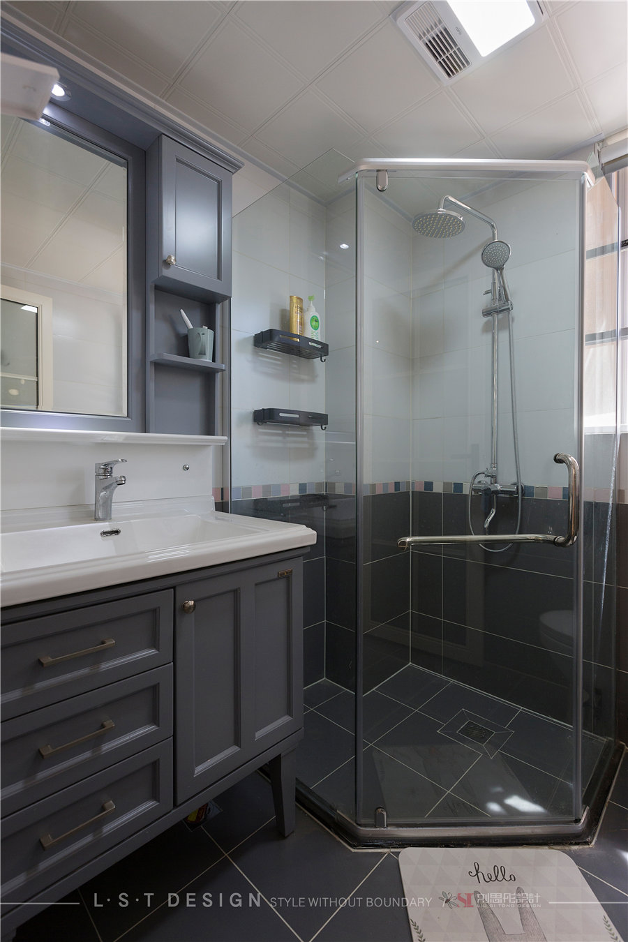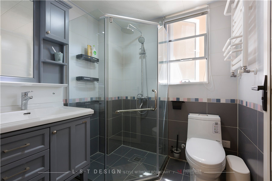 ▲粉蓝色马赛克腰线给素雅简单的卫生间带来活跃和生气。