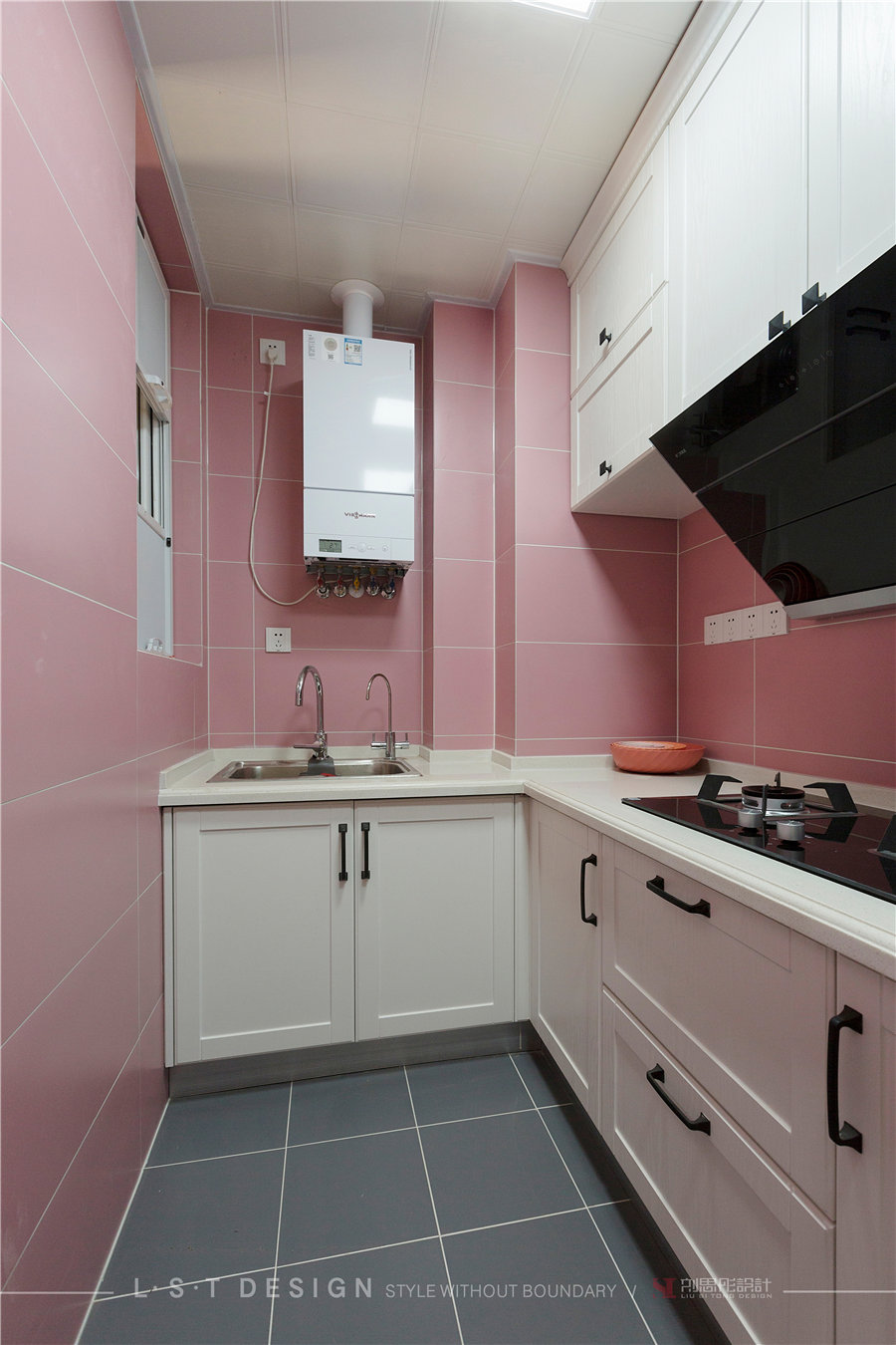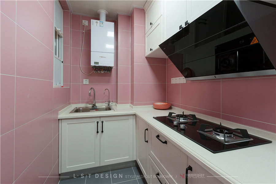 ▲厨房白色橱柜与粉色墙砖的碰撞,表现出极强的层次感。